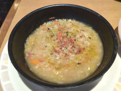 田舎風やわらかキャベツのスープ。これは思いの外美味しいかったです。そのまんまですが、柔らかく煮込んだキャベツのスープで、食べるスープって感じのやつです。刻んだ野菜がはいっているので、消化にも良さそうでヘルシーな感じもしていいです。サラダ代わりにもなる感じですね。