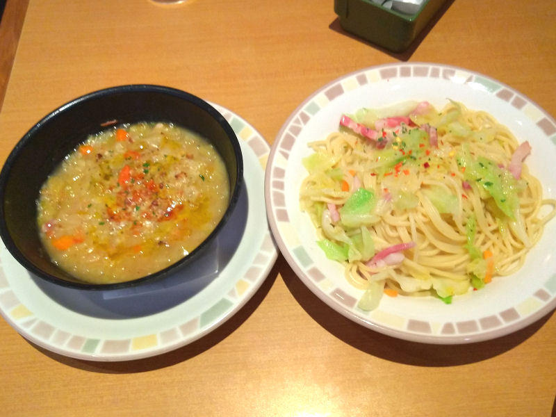 メインは、キャベツのペペロンチーノ。田舎風やわらかキャベツのスープを付けました。たぶん、キャベツのペペロンチーノは以前にも食べた事があるはずですが、いつ以来だろうか!?