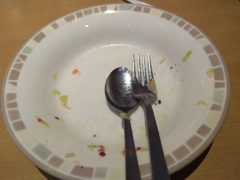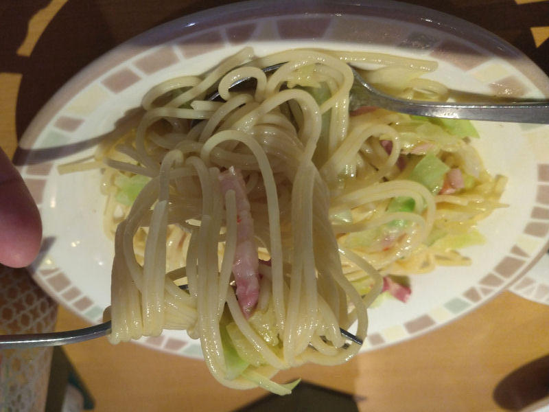 スパゲッティだと、あんまり麺上げはしないですかね。まあ、いつものサイゼリヤのスパゲッティです。