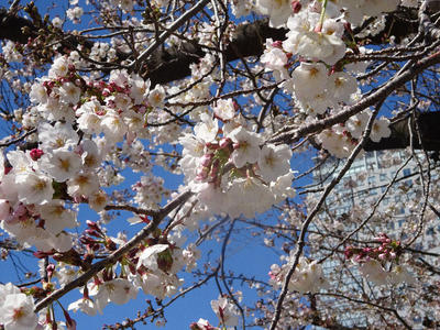 桜の木に寄ってみると、やはりまだ咲き方はまばらといった感じですね。満開の頃だと、かなり密集して咲いている感じがあるので、もう一息といったところです。来週末の方が満開かもしれないですね。