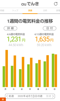 auでんきに切り替えてから日々の電気料金がわかるのですが、在宅勤務始まる前の一週間と比べるとやはり電気代が上がっていますね。日中家にいないのと家にいるのでは当然違ってはくるのですが。先週は月曜日が雨模様で気温も低めだったのでずっとエアコンつけてたので、かなり上がっています。それ以降は日中エアコン使っている時間が徐々に少なくはなってましたが、それでも多めでした。