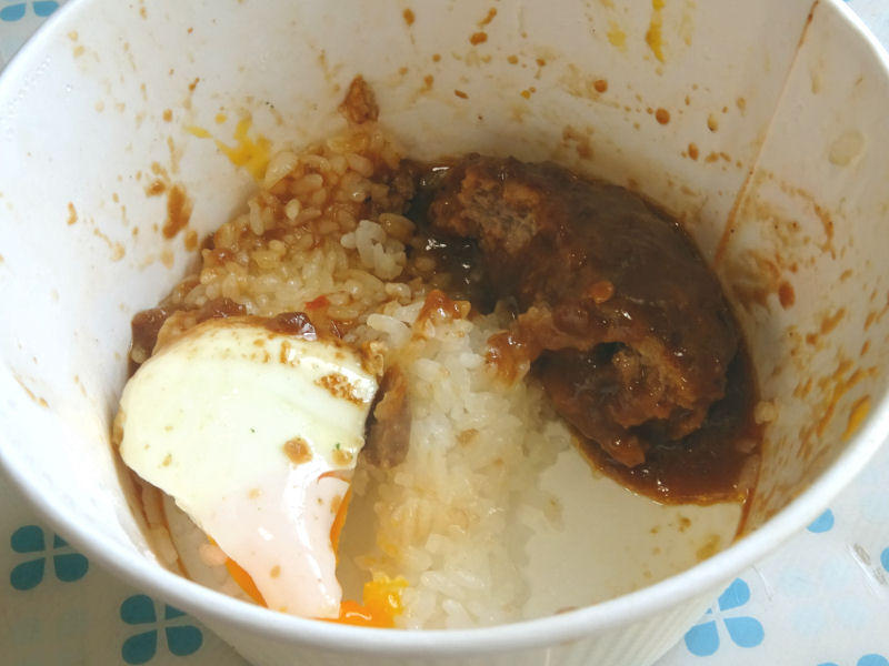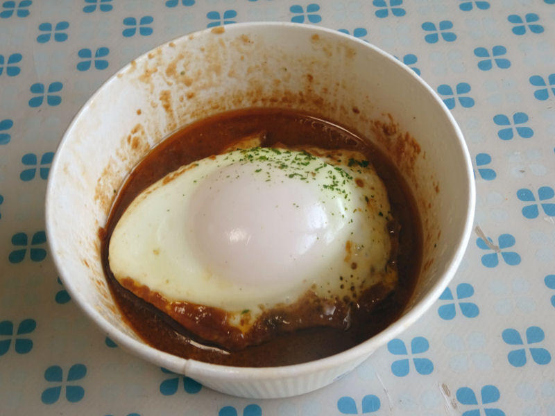 ブラウンソースエッグハンバーグです。目玉焼きでハンバーグが全く見えないですが、しっかり中にハンバーグがいます。