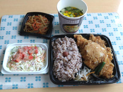 という事で、チキンかあさん煮弁当に、きんぴらごぼう、野菜たっぷり味噌汁を付けました。サラダはイオンで買ったもの。
