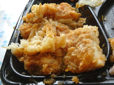 チキンかあさん煮のチキン。普通盛りごはんと比べても同じくらいの大きさ。ご飯のおかずとして食べると、途中であきらかにご飯の進みが早くて、チキンが余ってくるペースになってしまいました。土鍋ではないですが、しっかりとキチンかあさん煮の味が出ていました。お弁当でいつもの味が楽しめて大満足です。