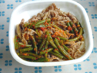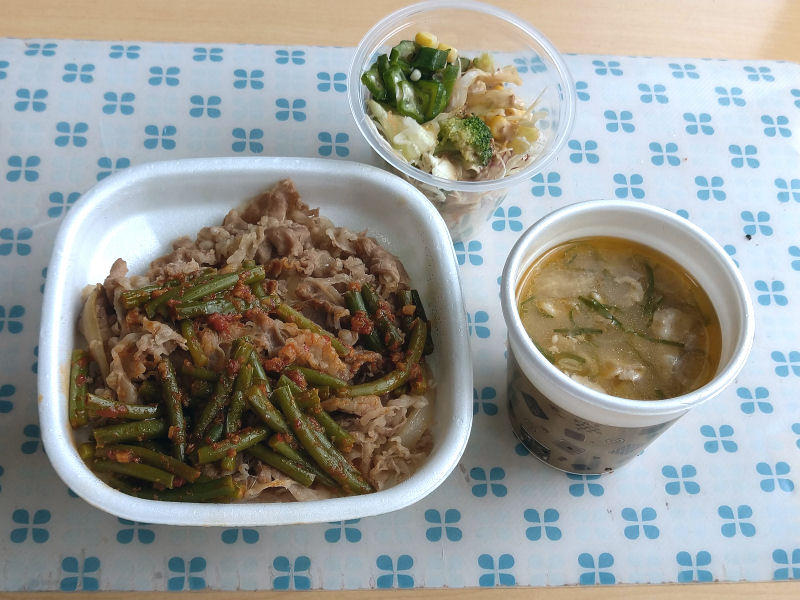 ニンニクの芽牛丼に、豚汁、オクラサラダをつけました。普段だと、豚汁くらいしか付けないんですけど、なんとなくサラダもつけるようになりました。
