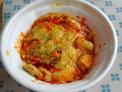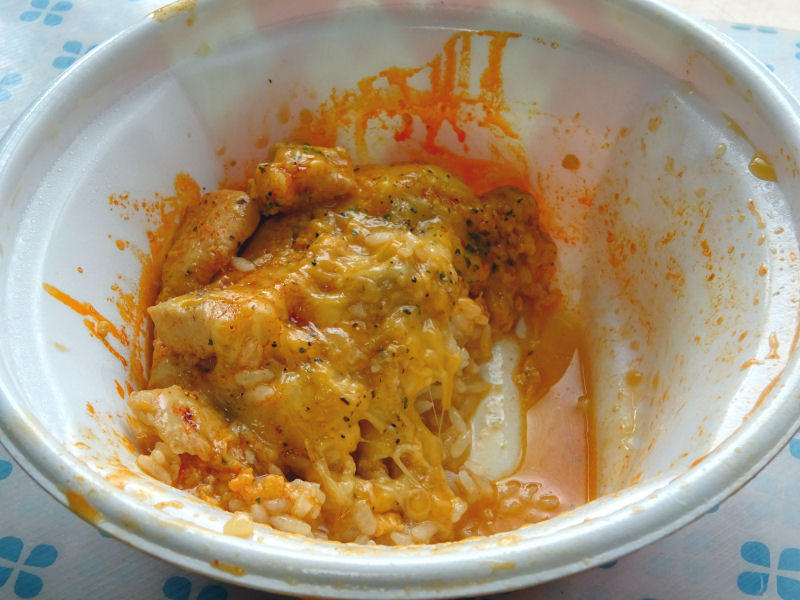 そして、メインの麻辣チーズ親子丼。だいぶ前にテイクアウトしたときは、親子丼もごはんにのった状態だったんですが、いつのまにか具がセパレートになっていました。これで、食べるときにのせられるので、親子丼のふわふわ感がキープされるというものです。