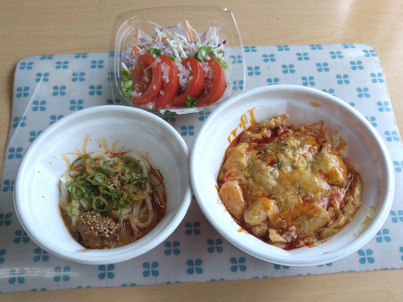 麻辣チーズ親子丼と冷やし坦々うどんの小。サラダはコンビニです。やっぱり、なか卯だとうどんも付けたくなるのです。