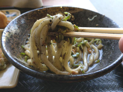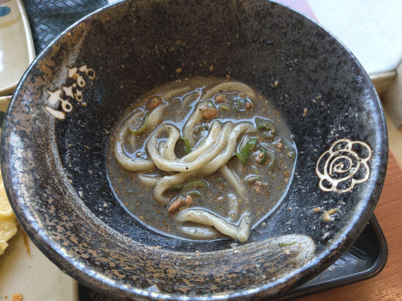 黒ごま坦々うどん、持ち上げるとこんな感じです。黒ごまがたっぷりなので、麺にも絡んできます。これは、さっぱりして美味しかったです。