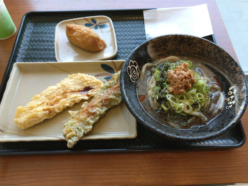 黒ごま坦々うどんに、とり天、ちくわ磯辺天、いなり寿司を注文しました。