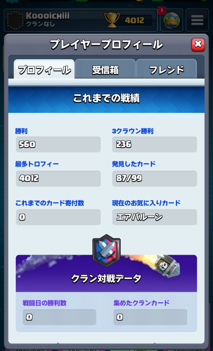この辺になると、レベルが上のカード持ちがたまに出てくるので、なかなか上にいけない。格上対策もしないといけないですが、4300を超えた辺りで、クランに参加。レベル上げも少しは楽になるかもって気はしてますが、どうなるかですね。