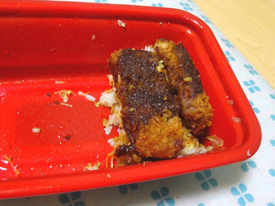 味噌ロースかつ丼、残り少しになりました。ご飯少ないかと思いましたが、結果的にはちょうどいい感じに。なにげに味噌かつ好きなので、ちゃんとした味噌かつ食べれて嬉しい勝ったですね。