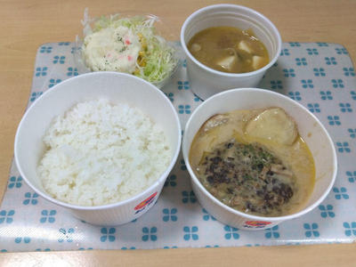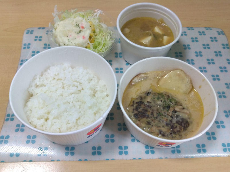 黒トリュフソースのハンバーグ定食ポテトサラダセットに、豚汁も付けました。