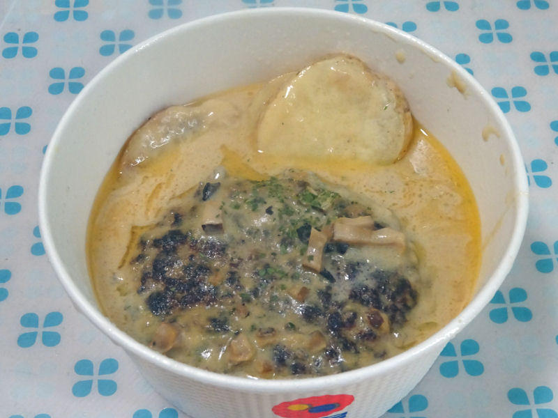 ビーフハンバーグをライスにオン。粗挽きハンバーグという感じで肉感がありますね。黒トリュフソースは、クリームソースっぽい感じですが、トリュフの風味がしっかりはいってます。