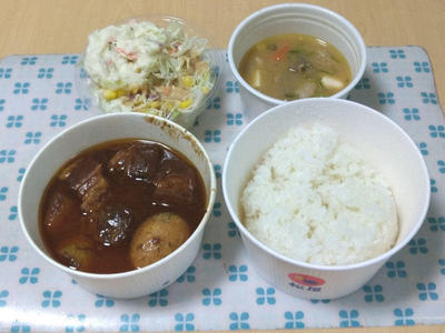 という事で、ビーフシチュー定食をテイクアウトしました。ポテトサラダと豚汁もセットにしました。