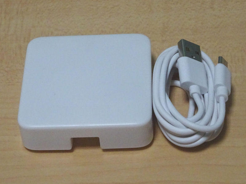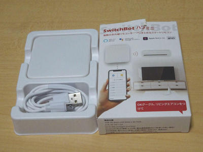 という事で、さっそく内容物を出してみます。ハブミニの本体に、電源供給用のUSBケーブルが付いてます。その他、取説もいちおうありますが、そこまで深くは書いてないので、わからない事があったら、SwitchBotのサイトで調べた方が良さそうです。