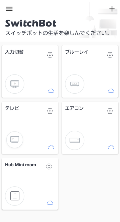 実際の、リモコンの学習自体は、SwitchBotのアプリより行なえます。とりあえず居室にあるエアコンやテレビ、ブルーレイくらいは登録しておきました。