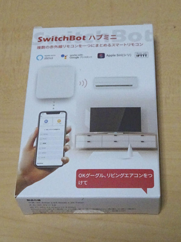 SwitchBot ハブミニ、外箱はこんな感じで、内容物自体が小さいので、シンプルな箱ですね。