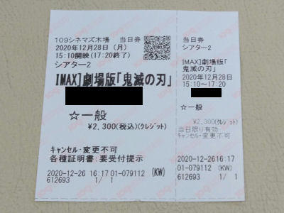 少し前になりますが、先月、12月28日、109シネマズ木場にて、劇場版「鬼滅の刃 無限列車編」2回目観てきました。今回は、IMAXにしました。