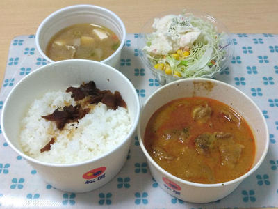 マッサマンカレーに生野菜+ポテトサラダに、豚汁も付けました。ライス大盛り無料だったので、ライスは大盛りにしました。