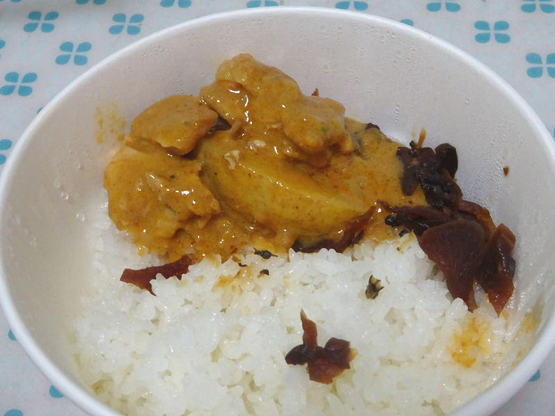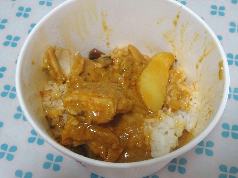 という事で、さっそく、チキンとポテトをライスにオンです。もっとスパイシーな感じがなと思ったんですが、それほど辛さは感じませんでした。ココナッツミルクが濃厚なせいか、思ったよりもやさしい味わいでした。
