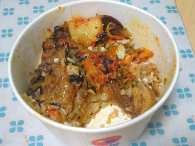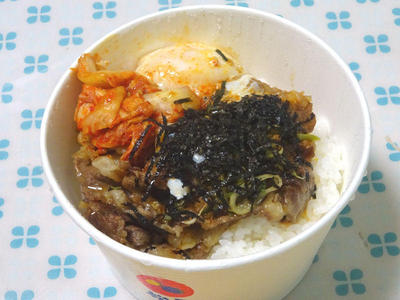 牛焼ビビン丼です。すこし、盛り付けが偏ってしまいましたが。肉は確かに焼いている牛肉ですね。