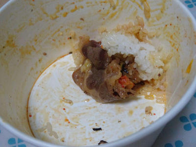 牛焼ビビン丼、通常のビビン丼に比べると、牛肉が肉肉しくてちょっと豪華になった気分ではありますね。旨辛だれと温玉が合わさって、食欲が進む味つけになっています。