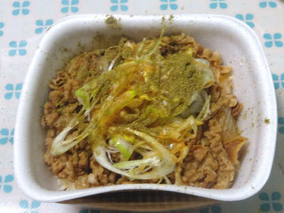 ねぎ山椒牛丼、半分くらいたべたところです。この山椒とねぎが、いつもの牛丼に風味がついて、病みつきになりそうです。これは、確かに美味しい。