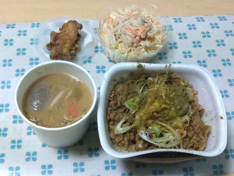 ねぎ山椒牛丼の頭の大盛りに、豚汁、ごぼうサラダ、唐揚げ1個をいっしょに注文しました。
