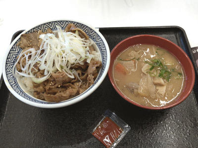 吉野家が始めた牛焼肉メニュー3種のうちの1つ、牛カルビ丼を食べてみる事にしました。豚汁も付けてます。