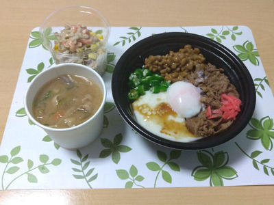 ネバとろ牛丼に、ごぼうサラダと豚汁もつけました。シンプルだけど、バランス良さげ。