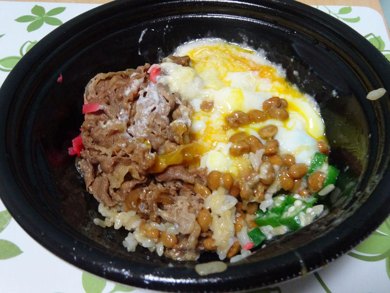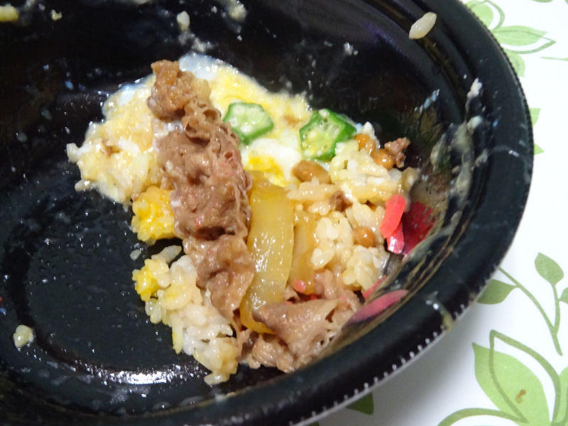 ネバとろ牛丼、全部トッピングするとこんな感じです。ごはんの量にすると具が明らかに多すぎな気がしてきました。はい、食べ始めてすぐに、これごはん少ないかもと。