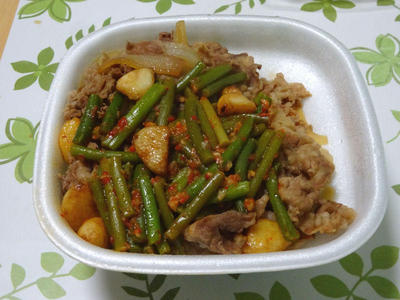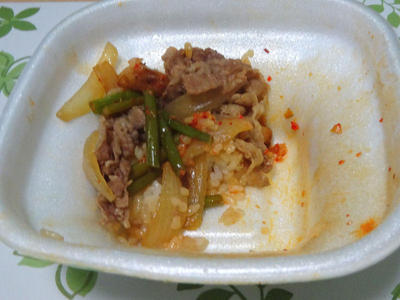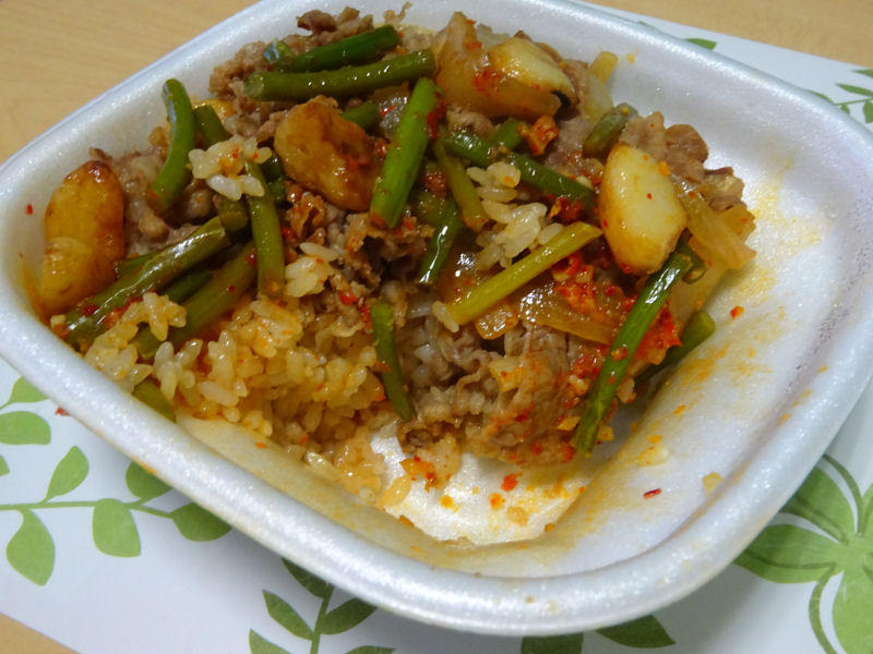 という事でWニンニク牛丼なのです。ニンニクの芽にプラスして、にんにくがどっさりなのです。ピリ辛ソースで、辛めの味付けなのは、いつもどおりです。