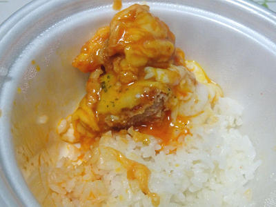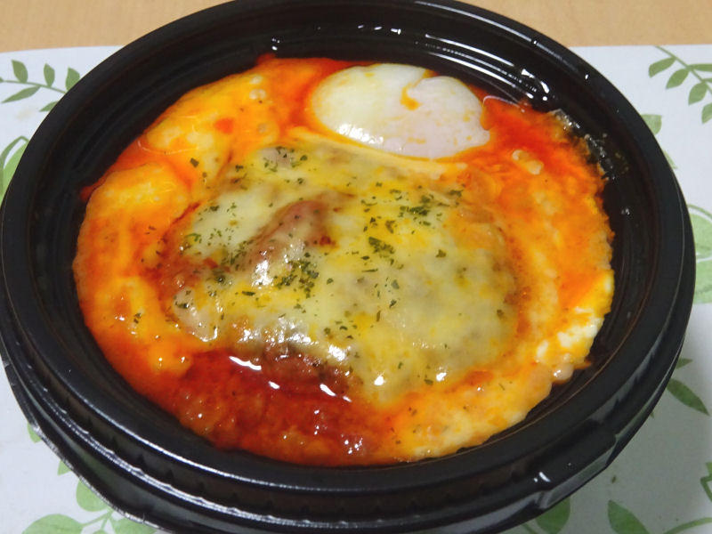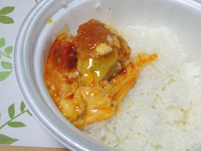 さっそく、ハンバーグ&チーズをごはんにオン。トマトソースのハンバーグに、チーズが絡んで、絶妙のうまさです。ハンバーグは、いつもの松屋のハンバーグですが、これはソースが変わるだけで、雰囲気変わりますね。