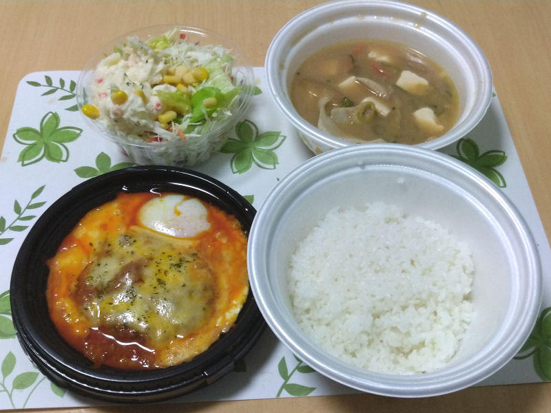 という訳で、ごろごろ野菜のうまトマチーズハンバーグ定食。ポテトサラダに、豚汁も付けています。ご飯は、普通盛り。