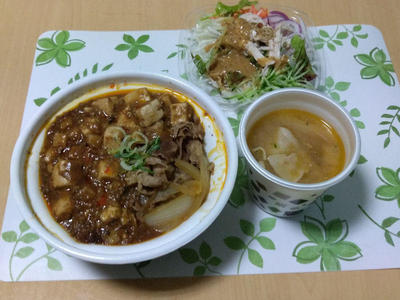 たまにはすき家という事で、このメニュー。麻婆豆腐とともにエビチリもやってたんで、別に夕ご飯ように勝って食べましたが、こちらも