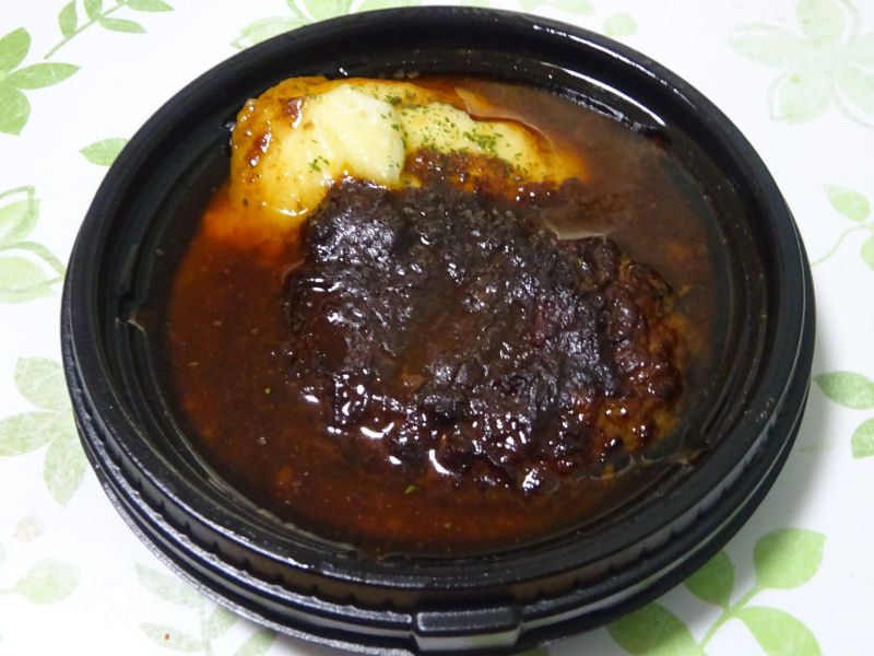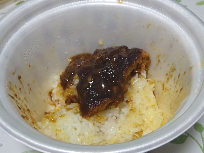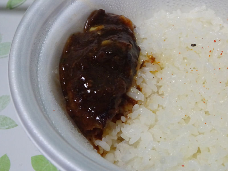 という事で、さっそくハンバーグをライスにオンです。黒毛和牛が90%という事で、お肉感たっぷりのハンバーグですね。このお肉感がごはんにもよく合います。