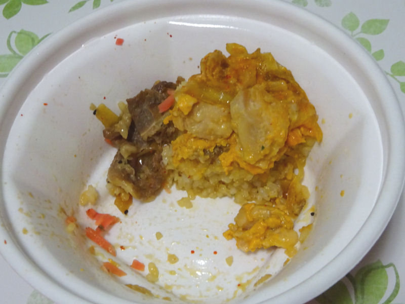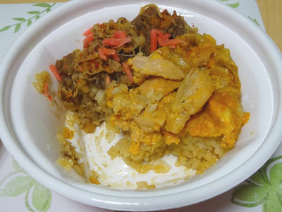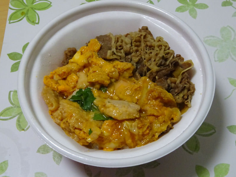 そして、牛・親子丼です。まあ、そのまんまなんですが、親子丼と牛丼のハーフ&ハーフです。と言いながらも、具はほぼ1人前のような気がしました。具が多めの丼って感じです。