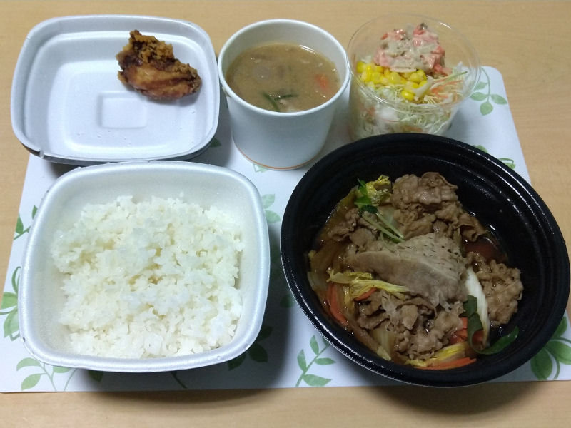 牛すき鍋膳のごはん大盛りです。ごぼうサラダ、豚汁に、唐揚げもつけました。