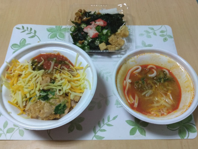 7/24(金)のお昼は、なか卯のテイクアウトにしました。珍しい組み合わせの麻辣チーズ親子丼を食べてみました。 -