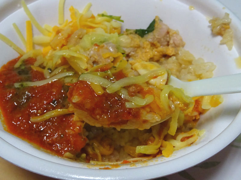 そして、チーズうまトマ親子丼。うまトマは、簡単に言うとアラビアータソースです。これに、チーズがたっぷりのせたら、そりゃ美味しいわけです。卵との相性もいい。