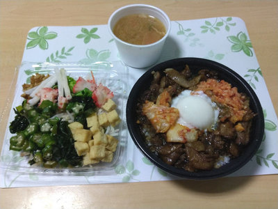 という事で、超すたみな豚焼肉丼に豚汁を付けました。サラダはイオンで買ったもの。