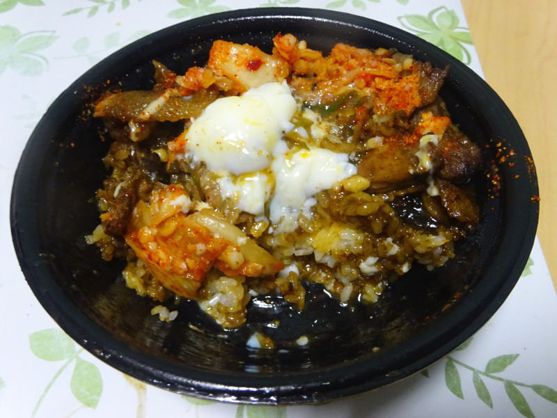 超すたみな豚焼肉丼です。豚焼肉丼ですが、ハラミに加えてカシラも入っていてボリューミー。キムチと温玉をトッピングされています。