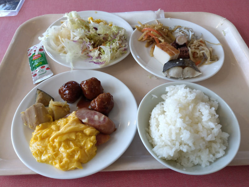翌朝、朝食もバイキングでした。夕食に比べると品数は少なめ。元々、お昼に行きたいところがあったので、そんなに食べるつもりはなかったので、ひとしきり食べてお終いにしました。