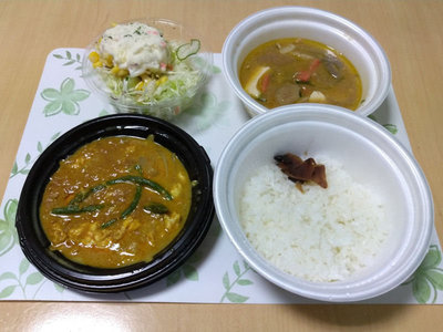 という事で、プーパッポンカレーに、豚汁とポテトサラダをつけました。。