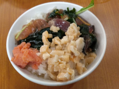 魚介類にお出しをかけてたべるのっけ盛り丼。見た目は、ちょっとあれですが、魚とお出しが絶妙にマッチして美味しい。でも、朝からお腹いっぱいになるので、このくらいで終わりにしました。