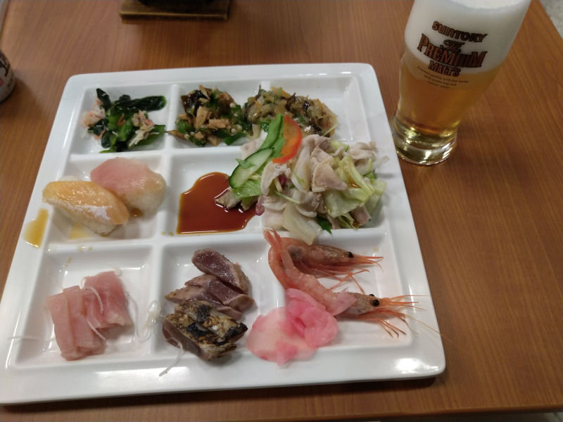 という事で、まずは夕食バイキング。結構な品数があって、お刺身やお寿司みあったりと、盛りだくさんでした。