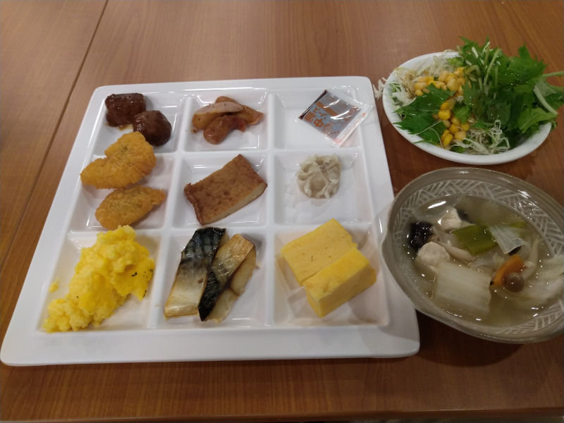 翌朝は、朝食バイキング。朝食らしいメニューが多い感じですかね。ごはんの他にもパンメニューもありました。