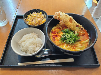 最後は、辛吉カレーうどんにちくわ天トッピング。ごはんとサラダをセットにしました。
