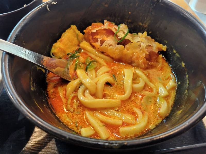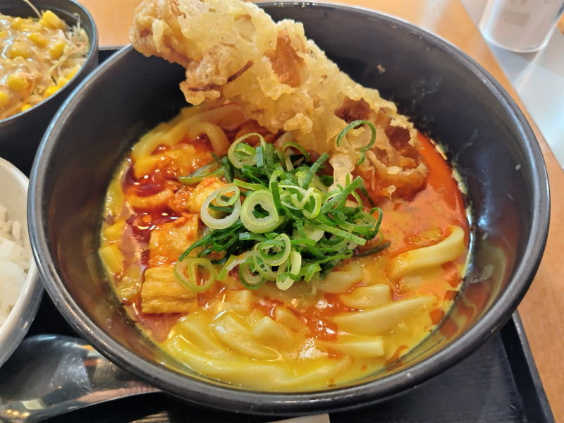 辛吉カレーうどんにちくわ天をトッピング。実は、トッピングするの初なんですよね。前に、トッピングしたのをSNSで見かけたので、一度やってみようと思ってたのですよ。