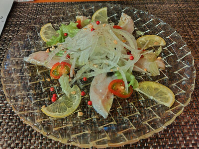 まずはビールで一杯やりつつ、季節の海鮮カルパッチョ。たしかに、海鮮メニューもあるので、こういうのもあります。あんまり、中華料理店って感じではないですね。
